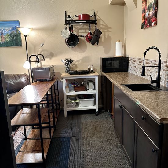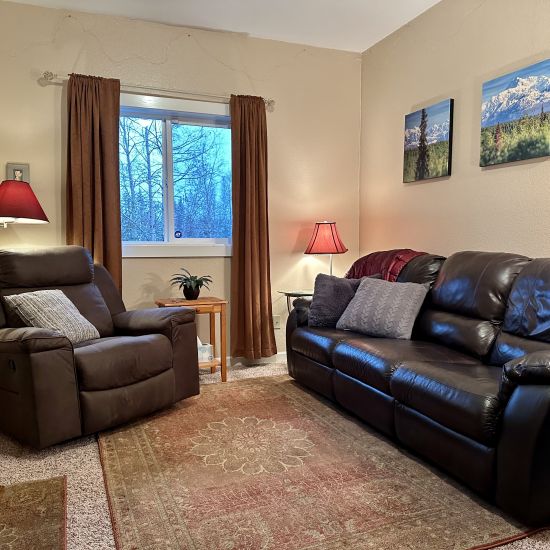 Fully Furnished 1 bed 1bath mother-in-law unit, all utilities included with small kitchenette. Located on bottom floor with private entrances choose 1 step entry or no steps. Located at end of quiet cul-de-sac with off street parking. Unobstructed views of mountains with beautiful views of Alpenglow’s, northern lights, sunrises and sunsets. Campbell creek runs thru the back yard. Watch moose and birds right in your “back yard” laundry on site. accepting applications