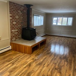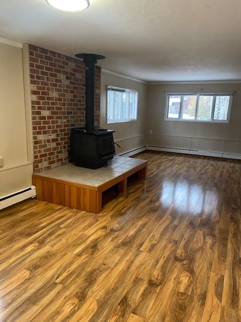 Main Floor: Garage, Laundry, One Bedroom, and living space with wood stove